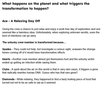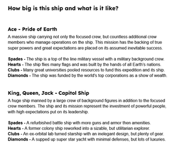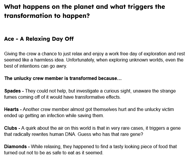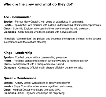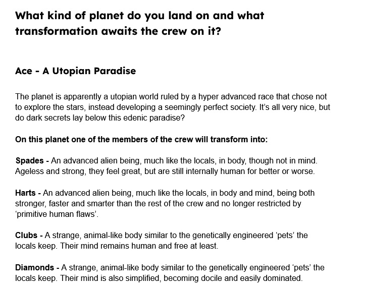 Using a deck of playing cards, you will randomly generate a crew, a ship, strange worlds, wacky adventures and transformations that will one by one change the crew, logging entries into your captains log all the way so that when you come back to Earth, humanity will have a story to explain why the ship is now full of super intelligent crystalline beings, frog-dogs, robots and for some reason a fantasy elf with actual magic powers...