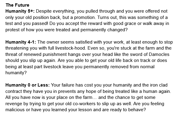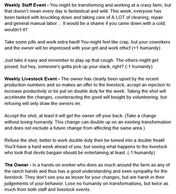 You thought this job offer was to good to be true, turns out, it was! Your not just working on a farm, your becoming a hybrid of various useful farmyard animals and must fight to retain enough humanity in the eyes of the farmers to eventually get back to your old life and not just be stuck as LIVESTOCK!